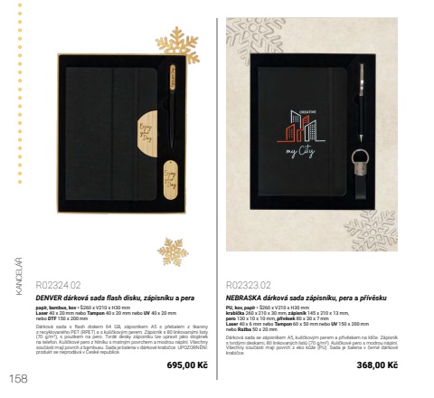158KANCEL%u00c1%u0158R02324.02DENVER d%u00e1rkov%u00e1 sada flash disku, z%u00e1pisn%u00edku a perapap%u00edr, bambus, kov %u2022 %u0160260 x V210 x H30 mmLaser 40 x 20 mm nebo Tampon 40 x 20 mm nebo UV 40 x 20 mmnebo DTF 150 x 200 mmD%u00e1rkov%u00e1 sada s flash diskem 64 GB, z%u00e1pisn%u00edkem A5 s p%u0159ebalem z tkaniny z recyklovan%u00e9ho PET (RPET) a s kuli%u010dkov%u00fdm perem. Z%u00e1pisn%u00edk s 80 linkovan%u00fdmi listy (70 g/m%u00b2), s poutkem na pero. Tvrd%u00e9 desky z%u00e1pisn%u00edku lze upravit jako stoj%u00e1nek na telefon. Kuli%u010dkov%u00e9 pero z hlin%u00edku s matn%u00fdm povrchem a modrou n%u00e1pln%u00ed. V%u0161echny sou%u010d%u00e1sti maj%u00ed povrch z bambusu. Sada je balena v d%u00e1rkov%u00e9 krabi%u010dce. UPOZORN%u011aN%u00cd: produkt se neprod%u00e1v%u00e1 v %u010cesk%u00e9 republice.695,00 K%u010dR02323.02NEBRASKA d%u00e1rkov%u00e1 sada z%u00e1pisn%u00edku, pera a p%u0159%u00edv%u011bskuPU, kov, pap%u00edr %u2022 %u0160260 x V210 x H30 mmkrabi%u010dka 260 x 210 x 30 mm, z%u00e1pisn%u00edk 145 x 210 x 13 mm, pero 130 x 10 x 10 mm, p%u0159%u00edv%u011bsek 80 x 30 x 7 mmLaser 40 x 6 mm nebo Tampon 60 x 50 mm nebo UV 150 x 200 mmnebo Ra%u017eba 50 x 20 mmD%u00e1rkov%u00e1 sada se z%u00e1pisn%u00edkem A5, kuli%u010dkov%u00fdm perem a p%u0159%u00edv%u011bskem na kl%u00ed%u010de. Z%u00e1pisn%u00edk s tvrd%u00fdmi deskami, 80 linkovan%u00fdch list%u016f (70 g/m%u00b2). Kuli%u010dkov%u00e9 pero s modrou n%u00e1pln%u00ed. V%u0161echny sou%u010d%u00e1sti maj%u00ed povrch z eko k%u016f%u017ee (PU). Sada je balena v %u010dern%u00e9 d%u00e1rkov%u00e9 krabi%u010dce.368,00 K%u010d