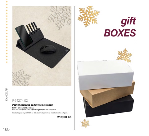 160KANCEL%u00c1%u0158giftBOXESR64274.02PEDRO podlo%u017eka pod my%u0161 se stojanemRPET %u2022 %u0160215 x V315 x H8 mmDTF 205 x 195 mm nebo S%u00edtotiskov%u00fd transfer 200 x 200 mmPodlo%u017eka pod my%u0161 z RPET se skl%u00e1dac%u00edm stojanem na mobiln%u00ed telefon a 4 pera.219,00 K%u010d