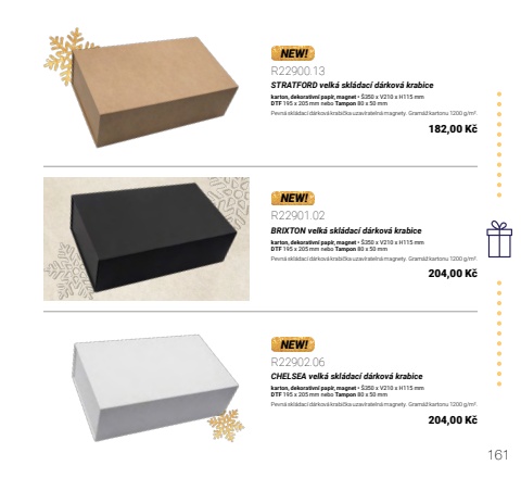 161R22901.02BRIXTON velk%u00e1 skl%u00e1dac%u00ed d%u00e1rkov%u00e1 krabicekarton, dekorativn%u00ed pap%u00edr, magnet %u2022 %u0160350 x V210 x H115 mmDTF 195 x 205 mm nebo Tampon 80 x 50 mmPevn%u00e1 skl%u00e1dac%u00ed d%u00e1rkov%u00e1 krabi%u010dka uzav%u00edrateln%u00e1 magnety. Gram%u00e1%u017e kartonu 1200 g/m%u00b2.204,00 K%u010dR22900.13STRATFORD velk%u00e1 skl%u00e1dac%u00ed d%u00e1rkov%u00e1 krabicekarton, dekorativn%u00ed pap%u00edr, magnet %u2022 %u0160350 x V210 x H115 mmDTF 195 x 205 mm nebo Tampon 80 x 50 mmPevn%u00e1 skl%u00e1dac%u00ed d%u00e1rkov%u00e1 krabi%u010dka uzav%u00edrateln%u00e1 magnety. Gram%u00e1%u017e kartonu 1200 g/m%u00b2.182,00 K%u010dR22902.06CHELSEA velk%u00e1 skl%u00e1dac%u00ed d%u00e1rkov%u00e1 krabicekarton, dekorativn%u00ed pap%u00edr, magnet %u2022 %u0160350 x V210 x H115 mmDTF 195 x 205 mm nebo Tampon 80 x 50 mmPevn%u00e1 skl%u00e1dac%u00ed d%u00e1rkov%u00e1 krabi%u010dka uzav%u00edrateln%u00e1 magnety. Gram%u00e1%u017e kartonu 1200 g/m%u00b2.204,00 K%u010dNEW!NEW!NEW!