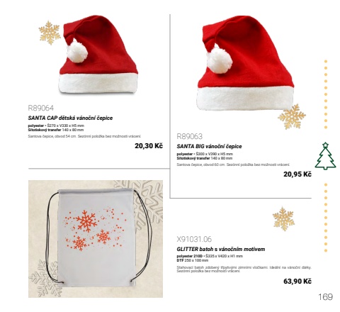 169R89064SANTA CAP d%u011btsk%u00e1 v%u00e1no%u010dn%u00ed %u010depicepolyester %u2022 %u0160270 x V330 x H5 mmS%u00edtotiskov%u00fd transfer 140 x 80 mmSantova %u010depice, obvod 54 cm. Sez%u00f3nn%u00ed polo%u017eka bez mo%u017enosti vr%u00e1cen%u00ed.20,30 K%u010dR89063SANTA BIG v%u00e1no%u010dn%u00ed %u010depicepolyester %u2022 %u0160300 x V390 x H5 mmS%u00edtotiskov%u00fd transfer 140 x 80 mmSantova %u010depice, obvod 60 cm. Sez%u00f3nn%u00ed polo%u017eka bez mo%u017enosti vr%u00e1cen%u00ed.20,95 K%u010dX91031.06GLITTER batoh s v%u00e1no%u010dn%u00edm motivempolyester 210D %u2022 %u0160335 x V420 x H1 mmDTF 250 x 100 mmStahovac%u00ed batoh zdoben%u00fd t%u0159pytiv%u00fdmi zimn%u00edmi vlo%u010dkami. Ide%u00e1ln%u00ed na v%u00e1no%u010dn%u00ed d%u00e1rky. Sez%u00f3nn%u00ed polo%u017eka bez mo%u017enosti vr%u00e1cen%u00ed.63,90 K%u010d