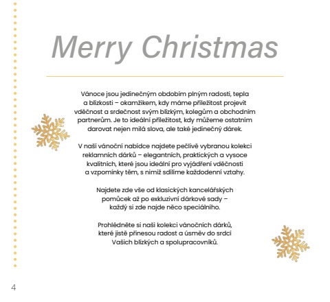 4V%u00e1noce jsou jedine%u010dn%u00fdm obdob%u00edm pln%u00fdm radosti, tepla a bl%u00edzkosti %u2013 okam%u017eikem, kdy m%u00e1me p%u0159%u00edle%u017eitost projevit vd%u011b%u010dnost a srde%u010dnost sv%u00fdm bl%u00edzk%u00fdm, koleg%u016fm a obchodn%u00edm partner%u016fm. Je to ide%u00e1ln%u00ed p%u0159%u00edle%u017eitost, kdy m%u016f%u017eeme ostatn%u00edm darovat nejen mil%u00e1 slova, ale tak%u00e9 jedine%u010dn%u00fd d%u00e1rek.V na%u0161%u00ed v%u00e1no%u010dn%u00ed nab%u00eddce najdete pe%u010dliv%u011b vybranou kolekci reklamn%u00edch d%u00e1rk%u016f %u2013 elegantn%u00edch, praktick%u00fdch a vysoce kvalitn%u00edch, kter%u00e9 jsou ide%u00e1ln%u00ed pro vyj%u00e1d%u0159en%u00ed vd%u011b%u010dnostia vzpom%u00ednky t%u011bm, s nimi%u017e sd%u00edl%u00edme ka%u017edodenn%u00ed vztahy. Najdete zde v%u0161e od klasick%u00fdch kancel%u00e1%u0159sk%u00fdchpom%u016fcek a%u017e po exkluzivn%u00ed d%u00e1rkov%u00e9 sady %u2013ka%u017ed%u00fd si zde najde n%u011bco speci%u00e1ln%u00edho.Prohl%u00e9dn%u011bte si na%u0161i kolekci v%u00e1no%u010dn%u00edch d%u00e1rk%u016f,kter%u00e9 jist%u011b p%u0159inesou radost a %u00fasm%u011bv do srdc%u00edVa%u0161ich bl%u00edzk%u00fdch a spolupracovn%u00edk%u016f.Merry Christmas