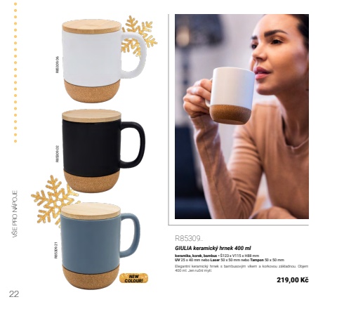22V%u0160E PRO N%u00c1POJER85309.02 R85309.06 R85309.21NEWCOLOUR!R85309..GIULIA keramick%u00fd hrnek 400 mlkeramika, korek, bambus %u2022 %u0160123 x V115 x H88 mmUV 25 x 40 mm nebo Laser 50 x 50 mm nebo Tampon 50 x 50 mmElegantn%u00ed keramick%u00fd hrnek s bambusov%u00fdm v%u00edkem a korkovou z%u00e1kladnou. Objem 400 ml. Jen ru%u010dn%u00ed myt%u00ed.219,00 K%u010d
