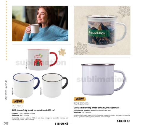 26V%u0160E PRO N%u00c1POJER85320.08R85320.42 R85320.02NEW!sublimationsublimationNEW!R85320..ARS keramick%u00fd hrnek na sublimaci 400 mlkeramika %u2022 %u016088 x V90 x H120 mmSublimace 200 x 70 mmKeramick%u00fd hrnek o objemu 400 ml ve stylu vintage se speci%u00e1ln%u00ed vrstvou pro sublima%u010dn%u00ed potisk. Jen ru%u010dn%u00ed myt%u00ed.118,00 K%u010dR08200.06ODIS smaltovan%u00fd hrnek 500 ml pro sublimaciuhl%u00edkov%u00e1 ocel, nerezov%u00e1 ocel %u2022 %u0160125 x V98 x H88 mmSublimace 210 x 60 mmSmaltovan%u00fd hrnek o objemu 500 ml ve stylu vintage s ou%u0161kem a okrajem z nerezov%u00e9 oceli a speci%u00e1ln%u00ed vrstvou pro sublimaci. Jen ru%u010dn%u00ed myt%u00ed.143,00 K%u010d