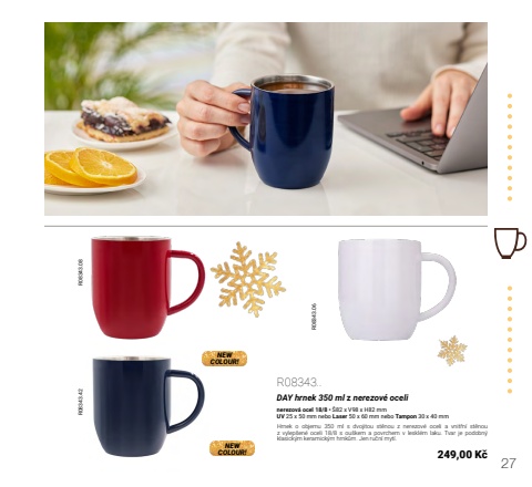 27R08343.42R08343.06R08343.08NEWCOLOUR!NEWCOLOUR!R08343..DAY hrnek 350 ml z nerezov%u00e9 ocelinerezov%u00e1 ocel 18/8 %u2022 %u016082 x V98 x H82 mmUV 25 x 50 mm nebo Laser 50 x 60 mm nebo Tampon 30 x 40 mmHrnek o objemu 350 ml s dvojitou st%u011bnou z nerezov%u00e9 oceli a vnit%u0159n%u00ed st%u011bnou z vylep%u0161en%u00e9 oceli 18/8 s ou%u0161kem a povrchem v leskl%u00e9m laku. Tvar je podobn%u00fd klasick%u00fdm keramick%u00fdm hrnk%u016fm. Jen ru%u010dn%u00ed myt%u00ed.249,00 K%u010d