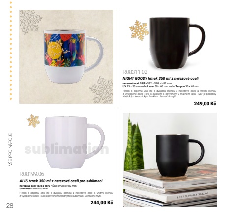 28V%u0160E PRO N%u00c1POJEsublimationR08199.06ALIS hrnek 350 ml z nerezov%u00e9 oceli pro sublimacinerezov%u00e1 ocel 18/8 a 18/0 %u2022 %u016082 x V98 x H82 mmSublimace 210 x 60 mmHrnek o objemu 350 ml s dvojitou st%u011bnou z nerezov%u00e9 oceli a vnit%u0159n%u00ed st%u011bnou z vylep%u0161en%u00e9 oceli 18/8 s povrchem vhodn%u00fdm k sublimaci. Jen ru%u010dn%u00ed myt%u00ed.244,00 K%u010dR08311.02NIGHT GOODY hrnek 350 ml z nerezov%u00e9 ocelinerezov%u00e1 ocel 18/8 %u2022 %u016082 x V98 x H82 mmUV 25 x 50 mm nebo Laser 50 x 60 mm nebo Tampon 30 x 40 mmHrnek o objemu 350 ml s dvojitou st%u011bnou z nerezov%u00e9 oceli a vnit%u0159n%u00ed st%u011bnou z vylep%u0161en%u00e9 oceli 18/8 s ou%u0161kem a povrchem v matn%u00e9m laku. Tvar je podobn%u00fd klasick%u00fdm keramick%u00fdm hrnk%u016fm. Jen ru%u010dn%u00ed myt%u00ed.249,00 K%u010d