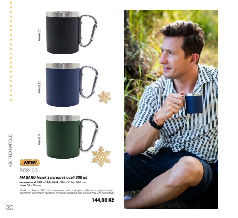 30V%u0160E PRO N%u00c1POJER08463.02 R08463.42 R08463.51NEW!R08463..MAGARO hrnek z nerezov%u00e9 oceli 300 mlnerezov%u00e1 ocel 18/8 a 18/0, hlin%u00edk %u2022 %u016076 x V116 x H90 mmLaser 50 x 50 mmHrnek o objemu 300 ml z nerezov%u00e9 oceli s dvojitou st%u011bnou a pogumovan%u00fdm povrchem p%u0159%u00edjemn%u00fdm na dotek. Praktick%u00e1 karabina jako ucho hrnku. Jen ru%u010dn%u00ed myt%u00ed.144,00 K%u010d