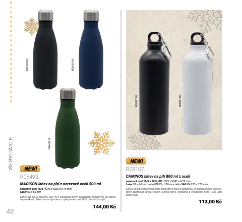 42V%u0160E PRO N%u00c1POJER08493.02 R08493.42 R08493.51R08107.02 R08107.06NEW!NEW!R08493..MADISON lahev na pit%u00ed z nerezov%u00e9 oceli 500 mlnerezov%u00e1 ocel 18/8 %u2022 %u016070 x V220 x H70 mmLaser 60 x 50 mmLahev na pit%u00ed o objemu 500 ml s pogumovan%u00fdm povrchem p%u0159%u00edjemn%u00fdm na dotek, neprot%u00e9kav%u00e1. St%u011bna lahve vyrobena z vylep%u0161en%u00e9 oceli 18/8. Jen ru%u010dn%u00ed myt%u00ed.144,00 K%u010dR08107..CAMINOS lahev na pit%u00ed 800 ml z ocelinerezov%u00e1 ocel 18/8 a 18/0, PP %u2022 %u016073 x V247 x H73 mmLaser 50 x 60 mm nebo UV 25 x 150 mm nebo 360 UV 225 x 170 mmLahev na pit%u00ed o objemu 800 ml z nerezov%u00e9 oceli s karabinou a nepropustn%u00fdm v%u00ed%u010dkem, kter%u00e9 zabra%u0148uje %u00faniku tekutin. St%u011bna lahve vyrobena z vylep%u0161en%u00e9 oceli 18/8. Jen ru%u010dn%u00ed myt%u00ed.113,00 K%u010d