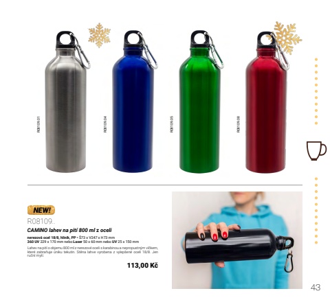 43R08109.01 R08109.04 R08109.05 R08109.08NEW!R08109..CAMINO lahev na pit%u00ed 800 ml z ocelinerezov%u00e1 ocel 18/8, hlin%u00edk, PP %u2022 %u016073 x V247 x H73 mm360 UV 229 x 170 mm nebo Laser 50 x 60 mm nebo UV 25 x 150 mmLahev na pit%u00ed o objemu 800 ml z nerezov%u00e9 oceli s karabinou a nepropustn%u00fdm v%u00ed%u010dkem, kter%u00e9 zabra%u0148uje %u00faniku tekutin. St%u011bna lahve vyrobena z vylep%u0161en%u00e9 oceli 18/8. Jen ru%u010dn%u00ed myt%u00ed.113,00 K%u010d