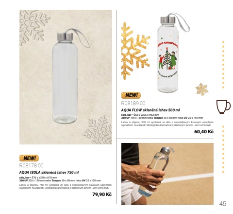 45NEW!NEW!R08178.00AQUA ISOLA sklen%u011bn%u00e1 lahev 750 mlsklo, kov %u2022 %u016070 x V250 x H70 mm360 UV 220 x 150 mm nebo Tampon 30 x 80 mm nebo UV 25 x 150 mmLahev o objemu 750 ml vyroben%u00e1 ze skla s neprot%u00e9kav%u00fdm kovov%u00fdm uz%u00e1v%u011brem a poutkem na z%u00e1p%u011bst%u00ed. Ekologick%u00e1 alternativa k plastov%u00fdm lahv%u00edm. Jen ru%u010dn%u00ed myt%u00ed.79,90 K%u010dR08189.00AQUA FLOW sklen%u011bn%u00e1 lahev 500 mlsklo, kov %u2022 %u016063 x V225 x H63 mm360 UV 198 x 150 mm nebo Tampon 30 x 80 mm nebo UV 25 x 140 mmLahev o objemu 500 ml vyroben%u00e1 ze skla s neprot%u00e9kav%u00fdm kovov%u00fdm uz%u00e1v%u011brem a poutkem na z%u00e1p%u011bst%u00ed. Ekologick%u00e1 alternativa k plastov%u00fdm lahv%u00edm. Jen ru%u010dn%u00ed myt%u00ed.60,40 K%u010d
