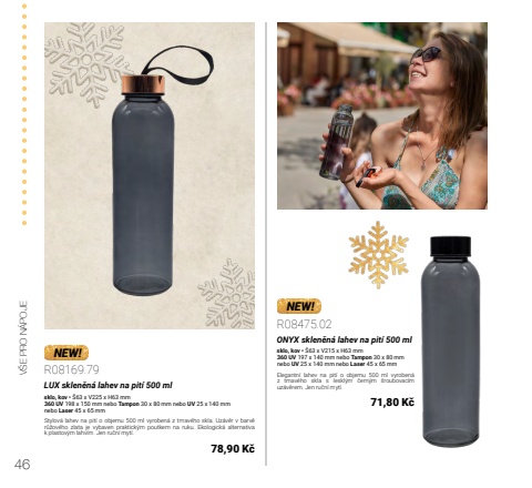 46V%u0160E PRO N%u00c1POJENEW!NEW!R08169.79LUX sklen%u011bn%u00e1 lahev na pit%u00ed 500 mlsklo, kov %u2022 %u016063 x V225 x H63 mm360 UV 198 x 150 mm nebo Tampon 30 x 80 mm nebo UV 25 x 140 mmnebo Laser 45 x 65 mmStylov%u00e1 lahev na pit%u00ed o objemu 500 ml vyroben%u00e1 z tmav%u00e9ho skla. Uz%u00e1v%u011br v barv%u011b r%u016f%u017eov%u00e9ho zlata je vybaven praktick%u00fdm poutkem na ruku. Ekologick%u00e1 alternativa k plastov%u00fdm lahv%u00edm. Jen ru%u010dn%u00ed myt%u00ed.78,90 K%u010dR08475.02ONYX sklen%u011bn%u00e1 lahev na pit%u00ed 500 mlsklo, kov %u2022 %u016063 x V215 x H63 mm360 UV 197 x 140 mm nebo Tampon 30 x 80 mmnebo UV 25 x 140 mm nebo Laser 45 x 65 mmElegantn%u00ed lahev na pit%u00ed o objemu 500 ml vyroben%u00e1 z tmav%u00e9ho skla s leskl%u00fdm %u010dern%u00fdm %u0161roubovac%u00edm uz%u00e1v%u011brem. Jen ru%u010dn%u00ed myt%u00ed.71,80 K%u010d