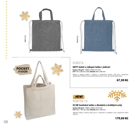 58R08574.02 R08574.04R08574..MOTI batoh a n%u00e1kupn%u00ed ta%u0161ka v jednombavlna 140 g/m%u00b2 %u2022 %u0160380 x V420 x H1 mmDTF 195 x 205 mm nebo S%u00edtotisk 250 x 250 mmBatoh a n%u00e1kupn%u00ed ta%u0161ka v jednom z melan%u017eov%u00e9 bavlny 140 g/m%u00b2. Vybaveno zapleten%u00fdmi %u0161%u0148%u016frkami pro pou%u017eit%u00ed jako batoh a uchy pro pou%u017eit%u00ed jako ta%u0161ka.67,30 K%u010dR08759.13ELSIE bavln%u011bn%u00e1 ta%u0161ka s dlouh%u00fdmi a kr%u00e1tk%u00fdmi uchybavlna 340 g/m%u00b2 %u2022 %u0160380 x V400 x H110 mmDTF 205 x 195 mm nebo S%u00edtotisk 250 x 250 mmN%u00e1kupn%u00ed ta%u0161ka z bavlny (340 g/m%u00b2) s dlouh%u00fdmi a kr%u00e1tk%u00fdmi uchy vybaven%u00e1 vnit%u0159n%u00ed kapsou.179,00 K%u010dNEW!