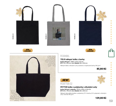 59R08486.02 R08486.21 R08486.42NEWCOLOUR!NEWCOLOUR!R08486..TELDI n%u00e1kupn%u00ed ta%u0161ka z bavlnybavlna 340 g/m%u00b2 %u2022 %u0160380 x V410 x H5 mmDTF 195 x 205 mm nebo S%u00edtotisk 250 x 250 mmN%u00e1kupn%u00ed ta%u0161ka s dlouh%u00fdmi uchy vyroben%u00e1 z recyklovan%u00e9 bavlny 340 g/m%u00b2.85,80 K%u010dR08758.02PEYTON ta%u0161ka z polybavlny s dlouh%u00fdmi uchybavlna 340 g/m%u00b2, polyester %u2022 %u0160370 x V350 x H150 mmDTF 205 x 195 mm nebo S%u00edtotisk 250 x 200 mmN%u00e1kupn%u00ed nebo pl%u00e1%u017eov%u00e1 ta%u0161ka z polybavlny (70 % bavlna, 30 % polyester) s dlouh%u00fdmi uchy. Gram%u00e1%u017e 340 g/m%u00b2.129,00 K%u010dNEW!