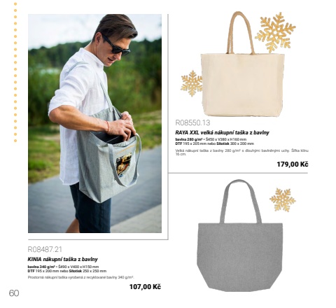 60R08550.13RAYA XXL velk%u00e1 n%u00e1kupn%u00ed ta%u0161ka z bavlnybavlna 280 g/m%u00b2 %u2022 %u0160450 x V380 x H160 mmDTF 195 x 205 mm nebo S%u00edtotisk 300 x 200 mmVelk%u00e1 n%u00e1kupn%u00ed ta%u0161ka z bavlny 280 g/m%u00b2 s dlouh%u00fdmi bavln%u011bn%u00fdmi uchy. %u0160%u00ed%u0159ka kl%u00ednu 16 cm.179,00 K%u010dR08487.21KINIA n%u00e1kupn%u00ed ta%u0161ka z bavlnybavlna 340 g/m%u00b2 %u2022 %u0160490 x V400 x H150 mmDTF 195 x 200 mm nebo S%u00edtotisk 250 x 250 mmProstorn%u00e1 n%u00e1kupn%u00ed ta%u0161ka vyroben%u00e1 z recyklovan%u00e9 bavlny 340 g/m%u00b2.107,00 K%u010d