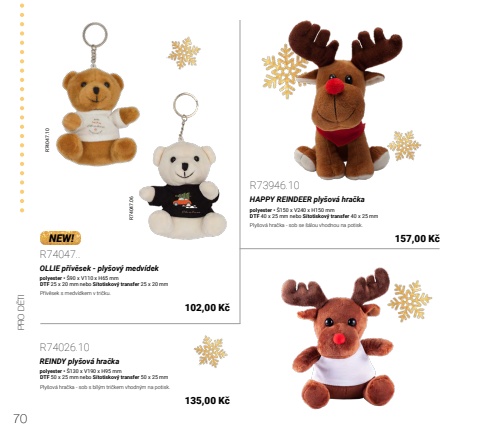 70PRO D%u011aTIR74047.06R74047.10R74047..OLLIE p%u0159%u00edv%u011bsek - ply%u0161ov%u00fd medv%u00eddekpolyester %u2022 %u016090 x V110 x H65 mmDTF 25 x 20 mm nebo S%u00edtotiskov%u00fd transfer 25 x 20 mmP%u0159%u00edv%u011bsek s medv%u00eddkem v tri%u010dku.102,00 K%u010dR73946.10HAPPY REINDEER ply%u0161ov%u00e1 hra%u010dkapolyester %u2022 %u0160150 x V240 x H150 mmDTF 40 x 25 mm nebo S%u00edtotiskov%u00fd transfer 40 x 25 mmPly%u0161ov%u00e1 hra%u010dka - sob se %u0161%u00e1lou vhodnou na potisk.NEW! 157,00 K%u010dR74026.10REINDY ply%u0161ov%u00e1 hra%u010dkapolyester %u2022 %u0160130 x V190 x H95 mmDTF 50 x 25 mm nebo S%u00edtotiskov%u00fd transfer 50 x 25 mmPly%u0161ov%u00e1 hra%u010dka - sob s b%u00edl%u00fdm tri%u010dkem vhodn%u00fdm na potisk.135,00 K%u010d