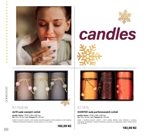 88DOM%u00c1CNOSTcandlesR17434.99ALTE sada vonn%u00fdch sv%u00ed%u010dekparaf%u00edn, karton %u2022 %u0160150 x V85 x H55 mmUV 120 x 70 mm nebo Tampon 85 x 50 mmSada 3 vonn%u00fdch sv%u00ed%u010dek s v%u016fn%u00ed vanilky, %u010dern%u00e9ho pep%u0159e a sm%u011bsi tulip%u00e1n%u016f a r%u016f%u017e%u00ed. Baleno v d%u00e1rkov%u00e9 kartonov%u00e9 krabi%u010dce. Doba ho%u0159en%u00ed cca 16 hodin.182,00 K%u010dR17476SCENTED sada parfemovan%u00fdch sv%u00ed%u010dekparaf%u00edn, karton %u2022 %u0160150 x V85 x H55 mmUV 120 x 70 mm nebo Tampon 85 x 50 mmSada 3 parfemovan%u00fdch sv%u00ed%u010dek s v%u016fn%u00ed vanilky (%u017elut%u00e1), k%u00e1vy (hn%u011bd%u00e1) a oce%u00e1nu (%u010derven%u00e1). Dod%u00e1v%u00e1no v d%u00e1rkov%u00e9 krabi%u010dce z kartonu se zdoben%u00fdm v%u00edkem. Doba ho%u0159en%u00ed cca 16 hodin.182,00 K%u010d