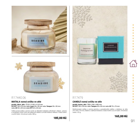 91R17440.06MATALA vonn%u00e1 sv%u00ed%u010dka ve skleparaf%u00edn, d%u0159evo, sklo %u2022 %u0160125 x V100 x H125 mmUV DTF 100 x 25 mm nebo Laser 60 x 50 mm nebo Tampon 50 x 50 mmnebo UV 65 x 65 mm nebo DTF 65 x 65 mmVelk%u00e1 vonn%u00e1 sv%u00ed%u010dka s aroma mo%u0159e ve sklen%u011bn%u00e9 n%u00e1dob%u011b s d%u0159ev%u011bn%u00fdm v%u00ed%u010dkem. Jemn%u00e1 a osv%u011b%u017euj%u00edc%u00ed v%u016fn%u011b mo%u0159e v%u00e1s p%u0159%u00edjemn%u011b nalad%u00ed a umo%u017en%u00ed klidnou relaxaci. Doba ho%u0159en%u00ed cca 80 hodin. Hmotnost vosku 480 g.185,00 K%u010dR17479CANDLE vonn%u00e1 sv%u00ed%u010dka ve skleparaf%u00edn, karton, sklo %u2022 %u016085 x V90 x H85 mmUV DTF 100 x 50 mm nebo Tampon 40 x 40 mm nebo UV 70 x 70 mmParfemovan%u00e1 sv%u00ed%u010dka s aroma jasm%u00ednu a gran%u00e1tov%u00e9ho jablka v n%u00e1dobce ze skla (70 x 84 x 70 mm). Baleno v d%u00e1rkov%u00e9 krabi%u010dce. Doba ho%u0159en%u00ed cca 25 hodin. Hmotnost vosku 125 g.165,00 K%u010d
