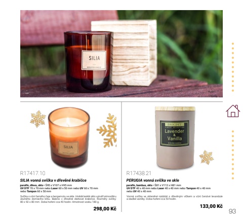 93R17417.10SILIA vonn%u00e1 sv%u00ed%u010dka v d%u0159ev%u011bn%u00e9 krabi%u010dceparaf%u00edn, d%u0159evo, sklo %u2022 %u016095 x V107 x H95 mmUV DTF 70 x 70 mm nebo Laser 60 x 50 mm nebo UV 60 x 70 mmnebo Tampon 60 x 50 mmSv%u00ed%u010dka s v%u016fn%u00ed %u010dern%u00e9ho %u010daje a bergamotu ve skle. Hn%u011bd%u00e9 leskl%u00e9 sklo vytv%u00e1%u0159%u00ed atmosf%u00e9ru %u00fatuln%u00e9ho dom%u00e1c%u00edho krbu. Baleno v d%u0159ev%u011bn%u00e9 d%u00e1rkov%u00e9 krabi%u010dce. Rozm%u011bry sv%u00ed%u010dky: 80 x 92 x 80 mm. Doba ho%u0159en%u00ed cca 40 hodin. Hmotnost vosku 180 g.298,00 K%u010dR17438.21PERUGIA vonn%u00e1 sv%u00ed%u010dka ve skleparaf%u00edn, bambus, sklo %u2022 %u016081 x V112 x H81 mmUV DTF 40 x 40 mm nebo Laser 40 x 40 mm nebo Tampon 40 x 40 mmnebo UV 40 x 40 mmVonn%u00e1 sv%u00ed%u010dka ve sklen%u011bn%u00e9 n%u00e1dob%u011b s d%u0159ev%u011bn%u00fdm v%u00ed%u010dkem a v%u016fn%u00ed %u010derstv%u00e9 levandule a sladk%u00e9 vanilky. Doba ho%u0159en%u00ed cca 50 hodin.133,00 K%u010d