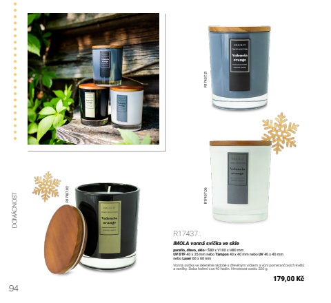 94DOM%u00c1CNOST R17437.02R17437.21 R17437.06R17437..IMOLA vonn%u00e1 sv%u00ed%u010dka ve skleparaf%u00edn, d%u0159evo, sklo %u2022 %u016080 x V100 x H80 mmUV DTF 40 x 35 mm nebo Tampon 40 x 40 mm nebo UV 40 x 40 mmnebo Laser 60 x 60 mmVonn%u00e1 sv%u00ed%u010dka ve sklen%u011bn%u00e9 n%u00e1dob%u011b s d%u0159ev%u011bn%u00fdm v%u00ed%u010dkem a v%u016fn%u00ed pomeran%u010dov%u00fdch kv%u011bt%u016f a vanilky. Doba ho%u0159en%u00ed cca 40 hodin. Hmotnost vosku 220 g.179,00 K%u010d