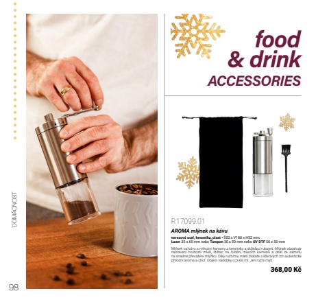 98DOM%u00c1CNOSTfood& drinkACCESSORIESR17099.01AROMA ml%u00fdnek na k%u00e1vunerezov%u00e1 ocel, keramika, plast %u2022 %u016052 x V180 x H52 mmLaser 35 x 60 mm nebo Tampon 30 x 50 mm nebo UV DTF 50 x 50 mmMl%u00fdnek na k%u00e1vu s mlec%u00edmi kameny z keramiky a skl%u00e1dac%u00ed rukojet%u00ed. Ml%u00fdnek obsahuje nastaven%u00ed hrubosti mlet%u00ed, %u0161t%u011btec na %u010di%u0161t%u011bn%u00ed mlec%u00edch kamen%u016f a obal ze sametu na snadn%u00e9 p%u0159ev%u00e1%u017een%u00ed ml%u00fdnku. D%u00edky ru%u010dn%u00edmu mlet%u00ed z%u00edsk%u00e1te z k%u00e1vov%u00fdch zrn autentick%u00e9 p%u0159%u00edrodn%u00ed aroma a chu%u0165. Objem n%u00e1dobky cca 60 ml. Jen ru%u010dn%u00ed myt%u00ed.368,00 K%u010d
