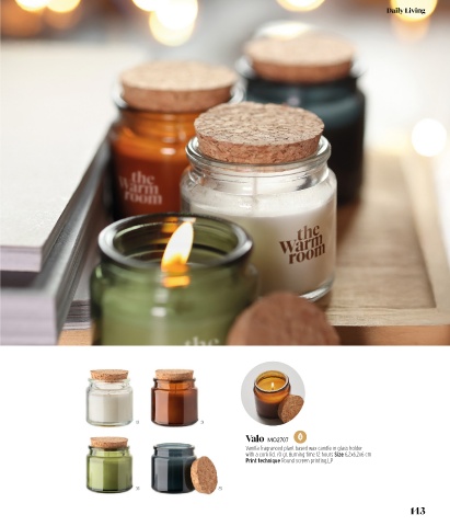 Daily Living 13 01 Valo MO2707 Vanilla fragranced plant based wax candle in glass holder with a cork lid. 70 gr. Burning time 12 hours Size 6,2x6,2x6 cm Print technique Round screen printing,L,P 09 85 143