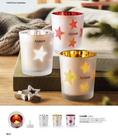 End of Year Experience Landle CX1572 LED tea light in ABS candle in glass jar. 1 button cell CR2032 battery included. Size 5,6x5,6x6,7 cm Print technique Round screen printing,L,P 16 98 05 164