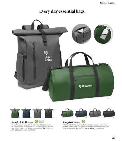 Roll top 15 inch laptop backpack in PU coated 600D RPET polyester and   Duffle bag in 600D RPET polyester with PU coating. Front zippered pocket. Inside