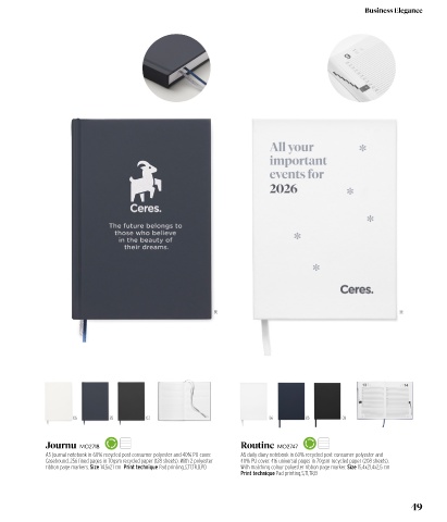 Casebound. 256 lined pages in 70gsm recycled paper (128 sheets). With 2 polyester 40% PU cover. 416 universal pages in 70gsm recycled paper (208 sheets).