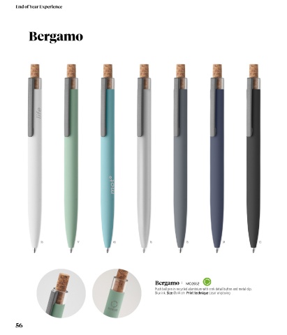 End of Year Experience Bergamo 06 77 66 16 15 04 03 Bergamo + MO2652 Push ball pen in recycled aluminium with cork detail button and metal clip. Blue ink. Size Ø1x14 cm Print technique Laser engraving 56