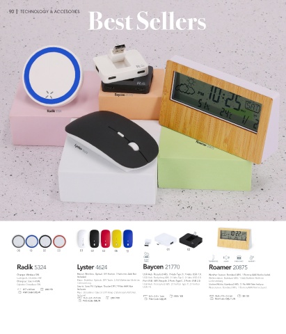 Charger. Wireless 5W. Mouse. Wireless. Optical. DPI Button. 2 Batteries AAA Not USB Hub. Recycled ABS. 2 Hubs Type C. 2 Hubs USB 2.0. Weather Station. Bamboo/ ABS. 1 Battery AAA Not Included.