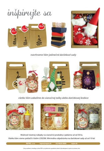 navrhneme V%u00e1m jedine%u010dn%u00e9 dar%u010dekov%u00e9 sadyv%u0161etko V%u00e1m zabal%u00edme do viano%u010dnej ta%u0161ky alebo dar%u010dekovej krabiceta%u0161kaMAL%u00c1ta%u0161kaSTREDN%u00c1ta%u0161kaVE%u013dK%u00c1REPRE, s.r.o. repre@repre.sk 02/4020 9000 repre.skin%u0161pirujte sa ...Mo%u017enos%u0165 vlastnej n%u00e1lepky na viano%u010dn%u00e9 produkty z pek%u00e1rne u%u017e od 50 ks. V%u0161etko V%u00e1m vieme potla%u010di%u0165 s Va%u0161%u00edm LOGOM. Minim%u00e1lna objedn%u00e1vka na dar%u010dekov%u00e9 sady u%u017e od 10 ks!Ceny uveden%u00e9 v katal%u00f3gu s%u00fa bez DPH a s%u00fa platn%u00e9 do vypredania z%u00e1sob. Vyhradzujeme si pr%u00e1vo na zmenu cien.