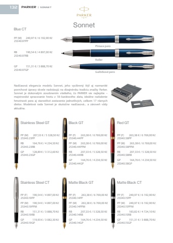 SonnetBlue CTNad%u010dasov%u00e1 elegancia modelu Sonnet, jeho vycibren%u00fd %u0161t%u00fdl aj rozmanit%u00e9 povrchov%u00e9 %u00fapravy skvele nadv%u00e4zuj%u00fa na dizajn%u00e9rsku trad%u00edciu zna%u010dky Parker. Sonnet je dokonal%u00fdm zosobnen%u00edm v%u0161etk%u00e9ho, %u010do PARKER vie najlep%u0161ie %u2013 majstrovsk%u00e9 spracovanie hrotu z 18%u2013kar%u00e1tov%u00e9ho zlata, ide%u00e1lne rozlo%u017eenie hmotnosti pera aj starostliv%u00e9 zostavenie jednotliv%u00fdch, celkom 17 r%u00f4znych dielov. Modelov%u00e1 rada Sonnet je skuto%u010dne nad%u010dasov%u00e1... a z%u00e1rove%u0148 v%u017edy aktu%u00e1lna.Stainless Steel GT Black GT Red GTStainless Steel CT Matte Black GT Matte Black CTRollerPlniace peroGu%u013e%u00f4%u010dkov%u00e9 peroPP (M) 240,97 %u20ac / 6 192,90 K%u010dRB 190,54 %u20ac / 4 897,00 K%u010dGP 151,31 %u20ac / 3 888,70 K%u010dPP (M) 207,33 %u20ac / 5 328,50 K%u010dPP (M) 263,38 %u20ac / 6 769,00 K%u010d PP (M) 263,38 %u20ac / 6 769,00 K%u010dPP (M) 190,54 %u20ac / 4 897,00 K%u010d PP (M) 263,38 %u20ac / 6 769,00 K%u010d PP (M) 240,97 %u20ac / 6 192,90 K%u010dRB 164,76 %u20ac / 4 234,50 K%u010dRB 207,33 %u20ac / 5 328,50 K%u010dPP (F) 263,38 %u20ac / 6 769,00 K%u010dRB 151,31 %u20ac / 3 888,70 K%u010d RB 207,33 %u20ac / 5 328,50 K%u010d RB 183,82 %u20ac / 4 724,10 K%u010dGP 128,89 %u20ac / 3 312,60 K%u010dGP 164,76 %u20ac / 4 234,50 K%u010dRB 207,33 %u20ac / 5 328,50 K%u010dGP 119,93 %u20ac / 3 082,30 K%u010d GP 164,76 %u20ac / 4 234,50 K%u010d GP 151,31 %u20ac / 3 888,70 K%u010d25340.97PP25340.97RB25340.97GP25340.23PP25340.44PPM 25340.58PPM25340.19PPM 25340.14PPM 25340.15PPM25340.23RB25340.44RB25340.58PP25340.19RB 25340.14RB 25340.15RB25340.23GP25340.44GP25340.58RB25340.19GP 25340.14GP 25340.15GPGP 164,76 %u20ac / 4 234,50 K%u010d25340.58GPPP (F) 263,38 %u20ac / 6 769,00 K%u010dPP (F) 190,54 %u20ac / 4 897,00 K%u010d PP (F) 263,38 %u20ac / 6 769,00 K%u010d PP (F) 240,97 %u20ac / 6 192,90 K%u010d25340.44PP25340.19PP 25340.14PP 25340.15PP132 PARKER | SONNET