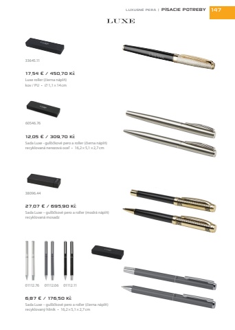 17,54 %u20ac / 450,70 K%u010dLuxe roller (%u010dierna n%u00e1pl%u0148)kov / PU %u2022 @ 1,1%u00d714cm12,05 %u20ac / 309,70 K%u010dSada Luxe -gu%u013e%u00f4%u010dkov%u00e9 pero a%u00a0roller (%u010dierna n%u00e1pl%u0148)recyklovan%u00e1 nerezov%u00e1 oce%u013e %u2022 16,2%u00d75,1%u00d72,7cm27,07 %u20ac / 695,90 K%u010dSada Luxe %u2013 gu%u013e%u00f4%u010dkov%u00e9 pero a%u00a0roller (modr%u00e1 n%u00e1pl%u0148)recyklovan%u00e1 mosadz6,87 %u20ac / 176,50 K%u010dSada Luxe %u2013 gu%u013e%u00f4%u010dkov%u00e9 pero a%u00a0roller (%u010dierna n%u00e1pl%u0148)recyklovan%u00fd hlin%u00edk %u2022 16,2%u00d75,1%u00d72,7cm60546.7638096.4401112.7633645.1101112.06 01112.11LUXUSN%u00c9 PER%u00c1 | P%u00cdSACIE POTREBY 147