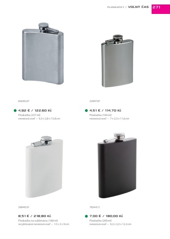7,00 %u20ac / 180,00 K%u010dPloska%u010dka (200ml)nerezov%u00e1 oce%u013e %u2022 9,2%u00d72,2%u00d712,2cm4,92 %u20ac / 122,60 K%u010dPloska%u010dka (237ml)nerezov%u00e1 oce%u013e %u2022 9,3%u00d72,8%u00d713,8cm4,51 %u20ac / 114,70 K%u010dPloska%u010dka (104ml)nerezov%u00e1 oce%u013e %u2022 7%u00d72,5%u00d711,6cm8,51 %u20ac / 218,80 K%u010dPloska%u010dka na sublim%u00e1ciu (180ml)recyklovan%u00e1 nerezov%u00e1 oce%u013e %u2022 12%u00d72%u00d79cm84240.07 32997.0726840.01 76244.11PLOSKA%u010cKY | VO%u013dN%u00dd %u010cAS 271