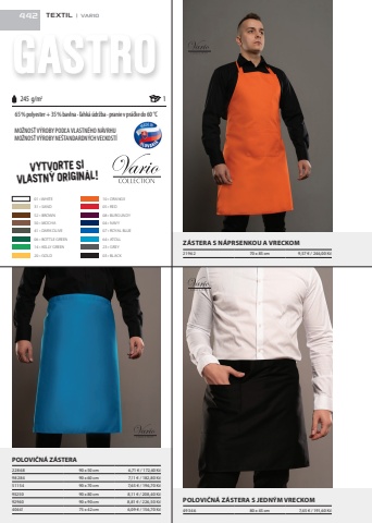 GASTRO245 g/m2 101 %u2022 WHITE31 %u2022 SAND52 %u2022 BROWN50 %u2022 MOCHA41 %u2022 DARK OLIVE06 %u2022 BOTTLE GREEN14 %u2022 KELLY GREEN20 %u2022 GOLD10 %u2022 ORANGE05 %u2022 RED08 %u2022 BURGUNDY04 %u2022 NAVY07 %u2022 ROYAL BLUE64 %u2022 ATOLL23 %u2022 GREY03 %u2022 BLACKPOLOVI%u010cN%u00c1 Z%u00c1STERA S JEDN%u00ddM VRECKOM49346 80 x 45 cm 7,45 %u20ac / 191,60 K%u010dZ%u00c1STERA S N%u00c1PRSENKOU A VRECKOM 21962 70 x 85 cm 9,57 %u20ac / 246,00 K%u010d65% polyester + 35% bavlna %u2022 %u013eahk%u00e1 %u00fadr%u017eba %u2022 pranie v pr%u00e1%u010dke do 60 %u00b0CMO%u017dNOS%u0164 V%u00ddROBY POD%u013dA VLASTN%u00c9HO N%u00c1VRHUMO%u017dNOS%u0164 V%u00ddROBY NE%u0160TANDARDN%u00ddCH VE%u013dKOST%u00cdpolovi%u010dn%u00e1 z%u00e1stera s JeDn%u00ddM vreCKoMA = p%u00e1syB = vreckoC = z%u00e1stera ABCGASTROVYTVORTE SI VLASTN%u00dd ORIGIN%u00c1L!65 % polyester + 35 % bavlna %uf0a0 %u013eahk%u00e1 %u00fadr%u017eba %uf0a0 pranie v pr%u00e1%u010dke do 60 %u00b0CMO%u017dNOS%u0165 v%u00fdROBy pOd%u013eA vlASTN%u00c9hO N%u00e1vRhuMO%u017dNOS%u0165 v%u00fdROBy NE%u0161TANdARdN%u00fdCh vE%u013ekOST%u00ed245 g/m 1 220%u00ad%u2022%u00adgold10%u00ad%u2022%u00adorange23%u00ad%u2022%u00adgrey 05%u00ad%u2022%u00adred07%u00ad%u2022%u00adroyal%u00adblue01%u00ad%u2022%u00adwHIte31%u00ad%u2022%u00adsand04%u00ad%u2022%u00adnavy08%u00ad%u2022%u00adburgundy14%u00ad%u2022%u00adkelly%u00adgreen06%u00ad%u2022%u00adbottle%u00adgreen03%u00ad%u2022%u00adblackFAREBN%u00c9 MO%u017dNOSTI318 textilz%u00e1stera s n%u00e1prsenKoU a vreCKoMA = p%u00e1sy B = vreckoC = z%u00e1stera ABCA52%u00ad%u2022%u00adbrown18 PETRUS 2013_SPARKS 2011 4/10/13 10:16 AM Str%u00e1nka 318POLOVI%u010cN%u00c1 Z%u00c1STERA22868 90 x 50 cm 6,71 %u20ac / 172,40 K%u010d98284 90 x 60 cm 7,11 %u20ac / 182,80 K%u010d51154 90 x 70 cm 7,65 %u20ac / 196,70 K%u010d93250 90 x 80 cm 8,11 %u20ac / 208,40 K%u010d92940 90 x 90 cm 8,81 %u20ac / 226,50 K%u010d40441 75 x 42 cm 6,09 %u20ac / 156,70 K%u010d442 TEXTIL | VARIO