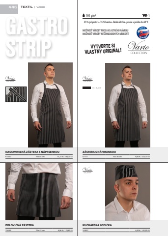 GASTROSTRIP195 g/m2 103 %u2022 BLACKpolovi%u010dn%u00e1 z%u00e1stera s JeDn%u00ddM vreCKoMA = p%u00e1syB = vreckoC = z%u00e1stera ABCGASTROVYTVORTE SI VLASTN%u00dd ORIGIN%u00c1L!65 % polyester + 35 % bavlna %uf0a0 %u013eahk%u00e1 %u00fadr%u017eba %uf0a0 pranie v pr%u00e1%u010dke do 60 %u00b0CMO%u017dNOS%u0165 v%u00fdROBy pOd%u013eA vlASTN%u00c9hO N%u00e1vRhuMO%u017dNOS%u0165 v%u00fdROBy NE%u0161TANdARdN%u00fdCh vE%u013ekOST%u00ed245 g/m 1 220%u00ad%u2022%u00adgold10%u00ad%u2022%u00adorange23%u00ad%u2022%u00adgrey 05%u00ad%u2022%u00adred07%u00ad%u2022%u00adroyal%u00adblue01%u00ad%u2022%u00adwHIte31%u00ad%u2022%u00adsand04%u00ad%u2022%u00adnavy08%u00ad%u2022%u00adburgundy14%u00ad%u2022%u00adkelly%u00adgreen06%u00ad%u2022%u00adbottle%u00adgreen03%u00ad%u2022%u00adblackFAREBN%u00c9 MO%u017dNOSTI318 textilz%u00e1stera s n%u00e1prsenKoU a vreCKoMA = p%u00e1sy B = vreckoC = z%u00e1stera ABCA52%u00ad%u2022%u00adbrown18 PETRUS 2013_SPARKS 2011 4/10/13 10:16 AM Str%u00e1nka 318POLOVI%u010cN%u00c1 Z%u00c1STERA 79649 70 x 42 cm 6,96 %u20ac / 178,80 K%u010dNASTAVITE%u013dN%u00c1 Z%u00c1STERA S N%u00c1PRSENKOU92837 70 x 85 cm 13,23 %u20ac / 340,20 K%u010dZ%u00c1STERA S N%u00c1PRSENKOU07711 70 x 85 cm 9,85 %u20ac / 253,10 K%u010dKUCH%u00c1RSKA LODI%u010cKA24807 4,00 %u20ac / 102,90 K%u010d65% polyester + 35% bavlna %u2022 %u013eahk%u00e1 %u00fadr%u017eba %u2022 pranie v pr%u00e1%u010dke do 60 %u00b0CMO%u017dNOS%u0164 V%u00ddROBY POD%u013dA VLASTN%u00c9HO N%u00c1VRHUMO%u017dNOS%u0164 V%u00ddROBY NE%u0160TANDARDN%u00ddCH VE%u013dKOST%u00cd446 TEXTIL | VARIO
