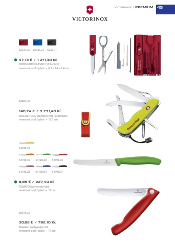 47,13 %u20ac / 1 211,30 K%u010dSWISSCARD CLASSIC (10 funkci%u00ed)nerezov%u00e1 oce%u013e / plast %u2022 8,2%u00d75,4%u00d70,4cm30,82 %u20ac / 792,10 K%u010dSkladac%u00ed kuchynsk%u00fd n%u00f4%u017enerezov%u00e1 oce%u013e / plast %u2022 11cm8,85 %u20ac / 227,40 K%u010dTOMATO kuchynsk%u00fd n%u00f4%u017enerezov%u00e1 oce%u013e / plast %u2022 11cm146,74 %u20ac / 3 771,40 K%u010dRESCUE TOOL vreckov%u00fd n%u00f4%u017e (13 funkci%u00ed)nerezov%u00e1 oce%u013e / plast %u2022 11,1cm54198.1154198.3530316.3554198.3954198.2854198.49 54198.2054198.0482803.3962331.35 62331.21 62331.11VICTORINOX | PREMIUM 45