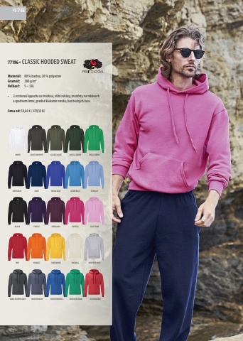 LIGHT GRAPHITE CLASSIC OLIVE BOTTLE GREEN KELLY GREENDEEP NAVY NAVY ROYAL BLUE AZURE BLUE SKY BLUEBLACK PURPLE BURGUNDY FUCHSIA LIGHT PINKRED ORANGE SUNFLOWER NATURALWHITEHEATHER GREYDARK HEATHER GREY HEATHER NAVY HEATHER ROYAL HEATHER GREEN HEATHER RED77196 %u2022 CLASSIC HOODED SWEATMateri%u00e1l: 80% bavlna, 20 % polyesterGram%u00e1%u017e: 280 g/m2Ve%u013ekos%u0165: S %u2013 5XL%u2022 2-vrstvov%u00e1 kapuc%u0148a so %u0161n%u00farkou, v%u0161it%u00e9 ruk%u00e1vy, man%u017eety na ruk%u00e1voch a%u00a0spodnom leme, predn%u00e9 klokanie vrecko, bez bo%u010dn%u00fdch %u0161vov.Cena od: 18,64 %u20ac / 479,10 K%u010d478 TEXTIL | MIKINY