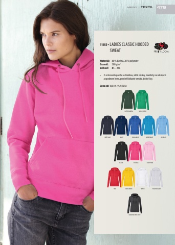BOTTLE GREEN KELLY GREENDEEP NAVY NAVY ROYAL BLUE AZURE BLUE SKY BLUEBLACK FUCHSIA LIGHT PINKRED SUNFLOWER WHITE HEATHER GREYDARK HEATHER GREY11155 %u2022 LADIES CLASSIC HOODED SWEATMateri%u00e1l: 80% bavlna, 20 % polyesterGram%u00e1%u017e: 280 g/m2Ve%u013ekos%u0165: XS %u2013 XXL%u2022 2-vrstvov%u00e1 kapuc%u0148a so %u0161n%u00farkou, v%u0161it%u00e9 ruk%u00e1vy, man%u017eety na ruk%u00e1voch a%u00a0spodnom leme, predn%u00e9 klokanie vrecko, bo%u010dn%u00e9 %u0161vy.Cena od: 18,64 %u20ac / 479,10 K%u010dMIKINY | TEXTIL 479