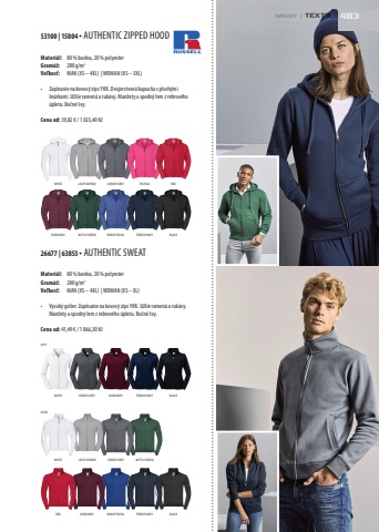 WHITE LIGHT OXFORD CONVOY GREY FUCHSIA REDBURGUNDYWHITEREDWHITE267F:267M:BLACKBLACKBLACKFRENCH NAVYFRENCH NAVYFRENCH NAVYBOTTLE GREENBRIGHT ROYALBURGUNDYBRIGHT ROYALCONVOY GREYBOTTLE GREENCONVOY GREYBURGUNDYLIGHT OXFORD53100 | 15804 %u2022 AUTHENTIC ZIPPED HOODMateri%u00e1l: 80% bavlna, 20% polyesterGram%u00e1%u017e: 280 g/m2Ve%u013ekos%u0165: MAN (XS %u2013 4XL) | WOMAN (XS %u2013 3XL)%u2022 Zap%u00ednanie na kovov%u00fd zips YKK. Dvojvrstvov%u00e1 kapuc%u0148a s%u00a0ploch%u00fdmi %u0161n%u00farkami. U%u017e%u0161ie ramen%u00e1 a%u00a0ruk%u00e1vy. Man%u017eety a%u00a0spodn%u00fd lem z%u00a0rebrov%u00e9ho %u00fapletu. Bo%u010dn%u00e9 %u0161vy.Cena od: 39,82 %u20ac / 1 023,40 K%u010d26677 | 63853 %u2022 AUTHENTIC SWEAT Materi%u00e1l: 80% bavlna, 20% polyesterGram%u00e1%u017e: 280 g/m2Ve%u013ekos%u0165: MAN (XS %u2013 4XL) | WOMAN (XS %u2013 XL)%u2022 Vysok%u00fd golier. Zap%u00ednanie na kovov%u00fd zips YKK. U%u017e%u0161ie ramen%u00e1 a%u00a0ruk%u00e1vy. Man%u017eety a%u00a0spodn%u00fd lem z%u00a0rebrov%u00e9ho %u00fapletu. Bo%u010dn%u00e9 %u0161vy.Cena od: 41,49 %u20ac / 1 066,30 K%u010dMIKINY | TEXTIL 483