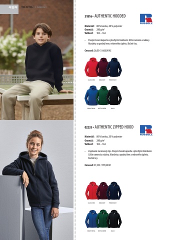 CLASSIC REDCLASSIC REDBRIGHT ROYALBRIGHT ROYALFRENCH NAVYFRENCH NAVYBLACKBLACKBURGUNDYBURGUNDYBOTTLE GREENBOTTLE GREEN31816 %u2022 AUTHENTIC HOODEDMateri%u00e1l: 80% bavlna, 20% polyesterGram%u00e1%u017e: 280 g/m2Ve%u013ekos%u0165: 104 %u2013 164%u2022 Dvojvrstvov%u00e1 kapuc%u0148a s%u00a0ploch%u00fdmi %u0161n%u00farkami. U%u017e%u0161ie ramen%u00e1 a%u00a0ruk%u00e1vy. Man%u017eety a%u00a0spodn%u00fd lem z%u00a0rebrov%u00e9ho %u00fapletu. Bo%u010dn%u00e9 %u0161vy.Cena od: 26,03 %u20ac / 668,90 K%u010d02235 %u2022 AUTHENTIC ZIPPED HOODMateri%u00e1l: 80% bavlna, 20% polyesterGram%u00e1%u017e: 280 g/m2Ve%u013ekos%u0165: 104 %u2013 164%u2022 Zap%u00ednanie na kovov%u00fd zips. Dvojvrstvov%u00e1 kapuc%u0148a s%u00a0ploch%u00fdmi %u0161n%u00farkami. U%u017e%u0161ie ramen%u00e1 a%u00a0ruk%u00e1vy. Man%u017eety a%u00a0spodn%u00fd lem z%u00a0rebrov%u00e9ho %u00fapletu. Bo%u010dn%u00e9 %u0161vy.Cena od: 31,10 %u20ac / 799,40 K%u010d484 TEXTIL | MIKINY