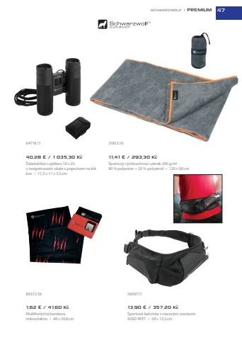 11,41 %u20ac / 293,30 K%u010d%u0160portov%u00fd r%u00fdchloschn%u00faci uter%u00e1k 300g/m280 % polyester + 20 % polyamid %u2022 120%u00d760cm40,28 %u20ac / 1 035,30 K%u010d%u010ealekoh%u013ead s%u00a0optikou 10%u00d725, v%u00a0neopr%u00e9novom obale s%u00a0popruhom na krkkov %u2022 11,5%u00d711%u00d73,5cm1,62 %u20ac / 41,60 K%u010dMultifunk%u010dn%u00e1 bandanamikrovl%u00e1kno %u2022 48%u00d724,8cm13,90 %u20ac / 357,20 K%u010d%u0160portov%u00e1 %u013eadvinka s%u00a0viacer%u00fdmi vreckami420D RPET %u2022 59%u00d713,5cm89372.56 56067.1164718.11 31853.16SCHWARZWOLF | PREMIUM 47