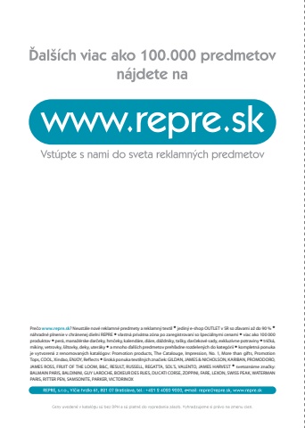 Pre%u010do www.repre.sk? Neust%u00e1le nov%u00e9 reklamn%u00e9 predmety a reklamn%u00fd textil %uf075 jedin%u00fd e-shop OUTLET v SR so z%u013eavami a%u017e do 90 % %uf075n%u00e1hradn%u00e9 plnenie v chr%u00e1nenej dielni REPRE %uf075 vlastn%u00e1 priv%u00e1tna z%u00f3na po zaregistrovan%u00ed so %u0161peci%u00e1lnymi cenami %uf075 viac ako 100 000 produktov %uf075 per%u00e1, mana%u017e%u00e9rske dar%u010deky, hrn%u010deky, kalend%u00e1re, di%u00e1re, d%u00e1%u017edniky, ta%u0161ky, dar%u010dekov%u00e9 sady, exkluz%u00edvne potraviny %uf075 tri%u010dk%u00e1, mikiny, vetrovky, %u0161iltovky, deky, uter%u00e1ky %uf075 a mnoho %u010fal%u0161%u00edch predmetov preh%u013eadne rozdelen%u00fdch do kateg%u00f3ri%u00ed %uf075 kompletn%u00e1 ponuka je vytvoren%u00e1 z renomovan%u00fdch katal%u00f3gov: Promotion products, The Catalouge, Impression, No. 1, More than gifts, Promotion Tops, COOL, Xindao, ENJOY, Reflects %uf075 %u0161irok%u00e1 ponuka textiln%u00fdch zna%u010diek: GILDAN, JAMES & NICHOLSON, KARIBAN, PROMODORO, JAMES ROSS, FRUIT OF THE LOOM, B&C, RESULT, RUSSELL, REGATTA, SOL%u00b4S, VALENTO, JAMES HARVEST %uf075 svetozn%u00e1me zna%u010dky: BALMAIN PARIS, BALDININI, GUY LAROCHE, BOXEUR DES RUES, DUCATI CORSE, ZOPPINI, FARE, LEXON, SWISS PEAK, WATERMAN PARIS, RITTER PEN, SAMSONITE, PARKER, VICTORINOX