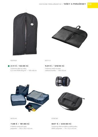 5,04 %u20ac / 129,50 K%u010dCestovn%u00fd obal na odevnetkan%u00e1 text%u00edlia %u2022 109%u00d765cm2,41 %u20ac / 62,00 K%u010dCestovn%u00fd obal na odev0,15 mm PEVA 60g/m%u00b2 %u2022 100%u00d760cm8,67 %u20ac / 222,90 K%u010dCestovn%u00fd obal na k%u00e1ble a%u00a0elektroniku600D polyester %u2022 19%u00d713,5%u00d74,5cm7,08 %u20ac / 181,90 K%u010d4-dielna cestovn%u00e1 sadapolyester %u2022 39,5%u00d729,5%u00d79,5cm96116.44 67267.8093379.03 02171.11CESTOVN%u00c9 PR%u00cdSLU%u0160ENSTVO | TA%u0160KY A PE%u0147A%u017dENKY 59