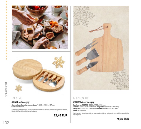 102DOM%u00c1CNOS%u0164R17128ROMA set na syrydrevo z kau%u010dukovn%u00edka, nerezov%u00e1 oce%u013e %u2022 %u0160235 x V235 x H37 mmLaser 50 x 60 mmSet na syry z tropick%u00e9ho kau%u010dukovn%u00edka s no%u017emi a vidli%u010dkou z nerezovej ocele v balen%u00ed, ktor%u00e9 sl%u00fa%u017ei aj ako do%u0161ti%u010dka na kr%u00e1janie.22,45 EURR17159.13ESTRELA set na syrybambus, oce%u013e 3CR13 %u2022 %u0160260 x V190 x H12 mmdo%u0161ti%u010dka %u0160260 x V190 x H12 mm, mal%u00fd n%u00f4%u017e %u0160130 x V28 x H27 mm, ve%u013ek%u00fd n%u00f4%u017e %u0160130 x V47 x H27 mm, vidli%u010dka %u0160135 x V27 x H27 mmLaser 60 x 50 mmSet na syry obsahuje n%u00f4%u017e na parmez%u00e1n, n%u00f4%u017e na polotvrd%u00fd syr, vidli%u010dku a do%u0161ti%u010dku na kr%u00e1janie.9,96 EUR