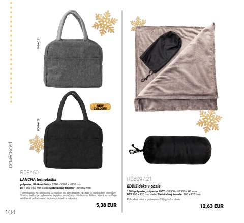 104DOM%u00c1CNOS%u0164R08460.02 R08460.21R08460..LANCHA termota%u0161kapolyester, hlin%u00edkov%u00e1 f%u00f3lia %u2022 %u0160230 x V190 x H130 mmDTF 150 x 60 mm alebo Sie%u0165otla%u010dov%u00fd transfer 150 x 60 mmTermota%u0161ka na potraviny a n%u00e1poje so zatv%u00e1ran%u00edm na zips a vonkaj%u0161%u00edm vreckom. Vn%u00fatro ta%u0161ky je vybaven%u00e9 tepelno izola%u010dnou hlin%u00edkovou f%u00f3liou, ktor%u00e1 umo%u017e%u0148uje udr%u017eiava%u0165 po%u017eadovan%u00fa teplotu potrav%u00edn a n%u00e1pojov.5,38 EURR08097.21EDDIE deka v obale100% polyester, polyester 190T %u2022 %u01601500 x V1300 x H2 mmDTF 200 x 120 mm alebo Sie%u0165otla%u010dov%u00fd transfer 200 x 120 mmPohodln%u00e1 deka z polyesteru 230 g/m%u00b2 v obale.12,63 EURNEWCOLOUR!