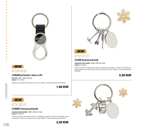 106DOM%u00c1CNOS%u0164NEW!NEW!NEW!R73318.02LENARD pr%u00edvesok z kovu a PUkov, PU %u2022 %u016027 x V66 x H9 mmLaser 12 x 12 mmElegantn%u00fd pr%u00edvesok kombinuj%u00faci kov a PU. Balen%u00e9 v %u010diernej dar%u010dekovej krabi%u010dke.1,68 EURR73132.01GYMKEY kovov%u00fd pr%u00edvesoknerezov%u00e1 oce%u013e, kart%u00f3n %u2022 %u016028 x V20 x H1 mmLaser 22 x 8 mmKovov%u00fd pr%u00edvesok s t%u00e9matikou fitness. Obsahuje pr%u00edvesky s mot%u00edvom kettlebellu, %u010dinky a pr%u00edvesok s plochou na grav%u00edrovanie loga. Balen%u00e9 v %u010diernej dar%u010dekovej krabi%u010dke.2,58 EURR73131.01CLEMI kovov%u00fd pr%u00edvesoknerezov%u00e1 oce%u013e, kart%u00f3n %u2022 %u016028 x V20 x H1 mmLaser 22 x 8 mmKovov%u00fd pr%u00edvesok s t%u00e9matikou n%u00e1radia. Obsahuje pr%u00edvesky s mot%u00edvom skrutkova%u010da, k%u013e%u00fa%u010da, kladiva a pr%u00edvesok s plochou na grav%u00edrovanie loga. Balen%u00e9 v %u010diernej dar%u010dekovej krabi%u010dke.2,58 EUR