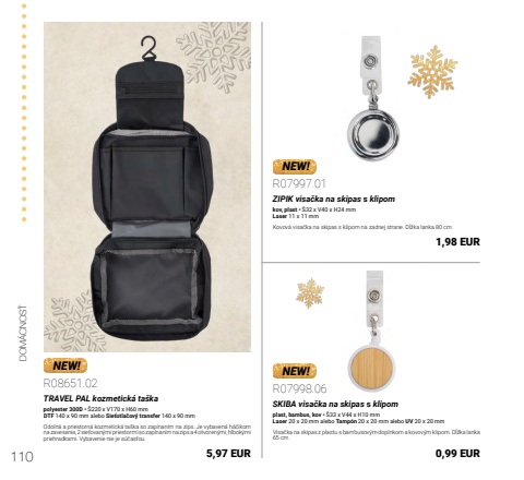 110DOM%u00c1CNOS%u0164NEW!NEW!NEW!R08651.02TRAVEL PAL kozmetick%u00e1 ta%u0161kapolyester 300D %u2022 %u0160220 x V170 x H60 mmDTF 140 x 90 mm alebo Sie%u0165otla%u010dov%u00fd transfer 140 x 90 mmOdoln%u00e1 a priestorn%u00e1 kozmetick%u00e1 ta%u0161ka so zap%u00ednan%u00edm na zips. Je vybaven%u00e1 h%u00e1%u010dikom na zavesenie, 2sie%u0165ovan%u00fdmi priestormi so zap%u00ednan%u00edm na zips a4 otvoren%u00fdmi, hlbok%u00fdmi priehradkami. Vybavenie nie je s%u00fa%u010das%u0165ou.5,97 EURR07997.01ZIPIK visa%u010dka na skipas s klipomkov, plast %u2022 %u016032 x V40 x H24 mmLaser 11 x 11 mmKovov%u00e1 visa%u010dka na skipas s klipom na zadnej strane. D%u013a%u017eka lanka 80 cm.1,98 EURR07998.06SKIBA visa%u010dka na skipas s klipomplast, bambus, kov %u2022 %u016033 x V44 x H10 mmLaser 20 x 20 mm alebo Tamp%u00f3n 20 x 20 mm alebo UV 20 x 20 mmVisa%u010dka na skipas z plastu s bambusov%u00fdm doplnkom a kovov%u00fdm klipom. D%u013a%u017eka lanka 65 cm.0,99 EUR