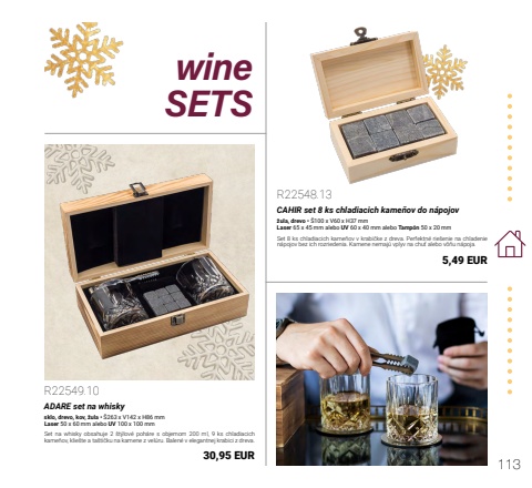 113wineSETSR22549.10ADARE set na whiskysklo, drevo, kov, %u017eula %u2022 %u0160263 x V142 x H86 mmLaser 50 x 60 mm alebo UV 100 x 100 mmSet na whisky obsahuje 2 %u0161t%u00fdlov%u00e9 poh%u00e1re s objemom 200 ml, 9 ks chladiacich kame%u0148ov, klie%u0161te a ta%u0161ti%u010dku na kamene z vel%u00faru. Balen%u00e9 v elegantnej krabici z dreva.30,95 EURR22548.13CAHIR set 8 ks chladiacich kame%u0148ov do n%u00e1pojov%u017eula, drevo %u2022 %u0160100 x V60 x H37 mmLaser 65 x 45 mm alebo UV 60 x 40 mm alebo Tamp%u00f3n 50 x 20 mmSet 8 ks chladiacich kame%u0148ov v krabi%u010dke z dreva. Perfektn%u00e9 rie%u0161enie na chladenie n%u00e1pojov bez ich rozriedenia. Kamene nemaj%u00fa vplyv na chu%u0165 alebo v%u00f4%u0148u n%u00e1poja.5,49 EUR