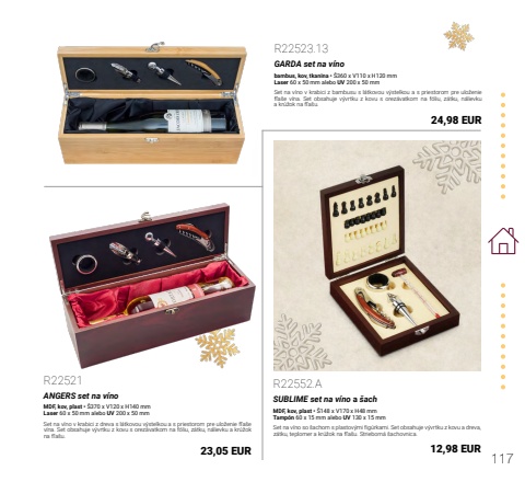 117R22521ANGERS set na v%u00ednoMDF, kov, plast %u2022 %u0160370 x V120 x H140 mmLaser 60 x 50 mm alebo UV 200 x 50 mmSet na v%u00edno v krabici z dreva s l%u00e1tkovou v%u00fdstelkou a s priestorom pre ulo%u017eenie f%u013ea%u0161e v%u00edna. Set obsahuje v%u00fdvrtku z kovu s orez%u00e1vatkom na f%u00f3liu, z%u00e1tku, n%u00e1lievku a kr%u00fa%u017eok na f%u013ea%u0161u.23,05 EURR22523.13GARDA set na v%u00ednobambus, kov, tkanina %u2022 %u0160360 x V110 x H120 mmLaser 60 x 50 mm alebo UV 200 x 50 mmSet na v%u00edno v krabici z bambusu s l%u00e1tkovou v%u00fdstelkou a s priestorom pre ulo%u017eenie f%u013ea%u0161e v%u00edna. Set obsahuje v%u00fdvrtku z kovu s orez%u00e1vatkom na f%u00f3liu, z%u00e1tku, n%u00e1lievku a kr%u00fa%u017eok na f%u013ea%u0161u.24,98 EURR22552.ASUBLIME set na v%u00edno a %u0161achMDF, kov, plast %u2022 %u0160148 x V170 x H48 mmTamp%u00f3n 60 x 15 mm alebo UV 130 x 15 mmSet na v%u00edno so %u0161achom s plastov%u00fdmi fig%u00farkami. Set obsahuje v%u00fdvrtku z kovu a dreva, z%u00e1tku, teplomer a kr%u00fa%u017eok na f%u013ea%u0161u. Strieborn%u00e1 %u0161achovnica.12,98 EUR