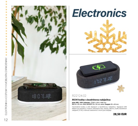 12ELEKTRONIKA A DOPLNKY K MOBILN%u00ddM ZARIADENIAMElectronicsR22124.02RICHI hodiny s bezdr%u00f4tovou nab%u00edja%u010dkouplast ABS, 100% polyester %u2022 %u0160200 x V64 x H98 mmUV 60 x 60 mm alebo UV DTF 50 x 50 mm alebo Tamp%u00f3n 50 x 40 mmViacfunk%u010dn%u00e9 hodiny s LED displejom a bezdr%u00f4tovou nab%u00edja%u010dkou. Nap%u00e1jan%u00e9 USB k%u00e1blom (je s%u00fa%u010das%u0165ou). Funkcie: zobrazenie %u010dasu, teploty, d%u00e1tumu, bud%u00edk, bezdr%u00f4tov%u00e9 nab%u00edjanie (15 W), mo%u017enos%u0165 nastavenia 3 %u00farovn%u00ed jasu displeja.28,50 EUR